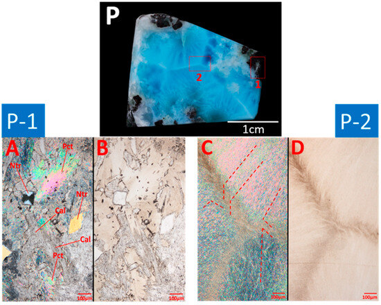 Due to the fact that the polarizing microscopy observations highlight the coexisting structures among natrolite, calcite, and pectolite, we specifically chose one sample where the three minerals were present simultaneously near the host rock, with an emphasis on the white wavy pattern characteristic. To better understand the nature of the enigmatic sea-wave pattern with radial fiber crystals in the Larimar (Figure 3), the thin sections at different positions in sample P were observed: in particular, one close to the wall rock (section P-1) and the other near the triple junction of the white streaks (section P-2) were observed (Figure 12). Under a polarized light microscope, in section P1, it was observed that Larimar was mainly composed of radial pectolite with intergrowth of anhedral calcite and euhedral natrolite (Figure 12A,B). The presence of these minerals was also confirmed by micro-Raman spectroscopy and SEM–EDS analysis. We also found that such pectolite aggregates with radial spheroids mostly grow inward from the host rock. The calcite observed was penetrated by pectolite, and sometimes blue pectolite filled the fissures of calcite (Figure 11). Natrolite was present in long prismatic crystals. The vertical long axis sections were square or rhombus-shaped, and their crystals were completely wrapped in calcite and pectolite. The Supplementary File indicates the evidence of natrolite growth along the host rock and the replacement by later-stage pectolite (Figures S1 and S2).