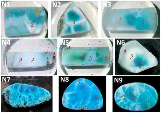 In order to check whether the color tones seen by the naked eye were consistent with the instrumental analysis data, samples N1 and N5 (Figure 13) were ground to a thickness of 1 mm. Transmission UV–Vis absorption spectroscopy, with a spot diameter of 5 mm, was used. The analysis results showed that the Larimar was not pure blue but rather a mixture of blue and green. The only difference was the proportion of blue to green color. The results of this analysis were consistent with the naked eye observations. All results of UV–Vis are shown in the Supplementary File (Figures S12–S16).