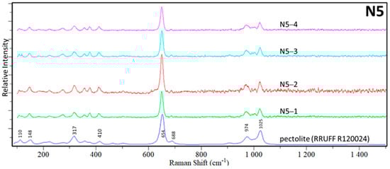 The Raman spectrum of each analysis point in sample N5, all of which were determined to be pectolite after comparison to the RRUFF database.