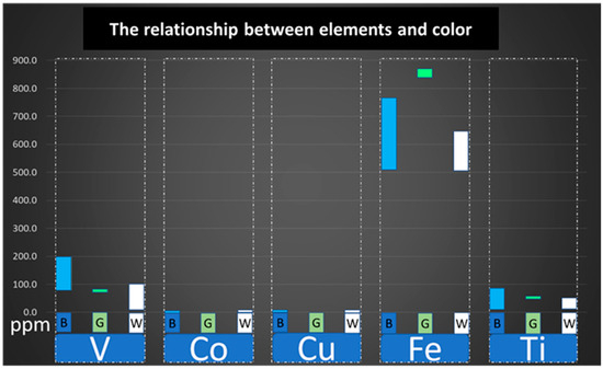Histogram of Larimar’s color and element correlations. The column-shaped color blocks represent the color of the pectolite: B for blue color, G for green color, and W for white and colorless.