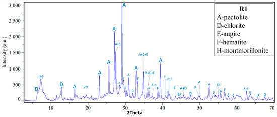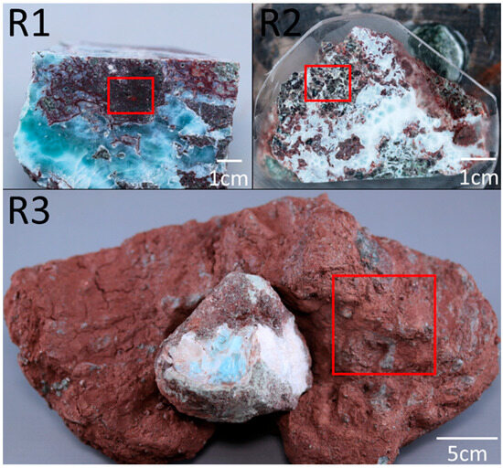 As for the wall rock, we chose the fragments of altered basalt and the laterite sample, which formed a more bluish Larimar, as the objects for analysis (R1, R2, and R3) (Figure 16). In order to avoid the influence of pectolite composition, most pectolite had been removed before the experiment, and only the host rock (R1 and R2) and laterite (R3) were analyzed by using ICP-MS. The analysis results of possible chromogenic elements are summarized in Table 3. The experimental results showed that iron, vanadium, cobalt, copper, and titanium are present in the wall rocks. Among them, the content of iron, copper, and titanium is much higher than that of cobalt and vanadium, which also means that the wall rocks containing these metal elements may be the cause for pectolite appearing blue–green. However, the elements that enter pectolite are mainly iron, vanadium, and titanium, while the content of copper and cobalt is minimal.