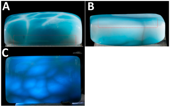 Observing Larimar from different angles; the red square frames in (A,B) are at the same position. However, the original dark-blue color in (A) turned white when it was flipped by 180°. (C) was used for the observation of penetrating light, and the transmittance at the white streaks was low.