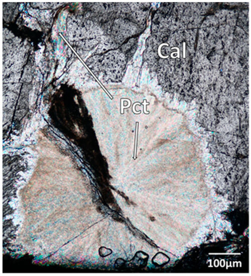 Therefore, the order of crystal growth between these three minerals should be natrolite → calcite → pectolite. In addition, pectolite was observed in P-2 with a white streak consisting of extremely fine radial fibers (Figure 13C,D) with high-order interference colors. It can be seen that spherulitic fibers developed from different crystal nuclei are in contact on the boundary. The crystal development direction is uneven and disordered due to a lack of space.