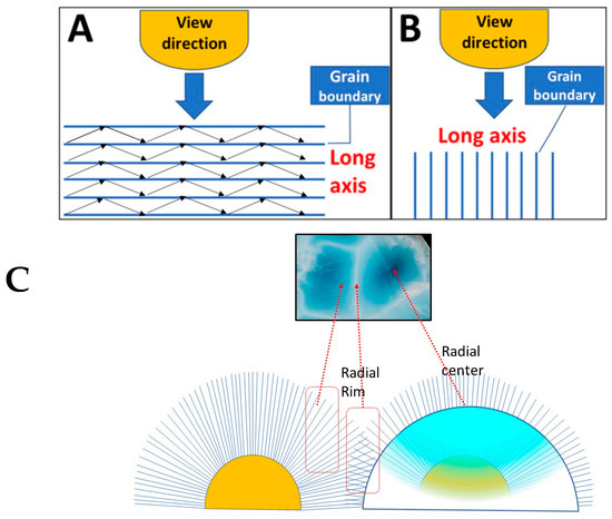 (A) The line of sight is perpendicular to the long axis of the fiber, and more light is reflected to the naked eye, leading to a white color. (B) When the line of sight is parallel to the long axis of the fiber, light passes directly through the crystals to our eyes, and the natural color can be seen. (C) Different directions of the radial ball crystals display a natural color in the cutting center and white reflection at the edge of the crystal boundary.