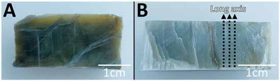 Based on the discussions above, we can divide the causes of white color in Larimar into physical and chemical factors. In the case of chemistry, the white or colorless color of pectolite is due to the scarce presence of chromophore elements. The physical mechanisms indicate the penetration and reflection of light based on the line of sight in relation to the crystal directions. These unique optical properties of fibrous minerals are also seen in other minerals, such as pink natrolite from Indonesia and cat’s-eye nephrite with a parallel fiber arrangement. The color variations are observed in different directions for fibrous nephrite (Figure 22). When our line of sight is parallel to the fiber direction, the natural color of nephrite is seen (Figure 22A), but the color becomes whiter if our view is vertical to the fibers (Figure 22B).