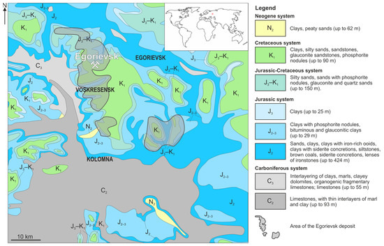 The Egorievsk nodular phosphorite deposit is located 90 km southeast of Moscow and covers an area of about 950 km2 [36,37]. Tectonically, the field is confined to a depression on the East European Platform, enclosed between the Oka-Tsninsk rampart and the Voronezh anteclise. The area consists of Middle and Upper Jurassic and Lower Cretaceous sedimentary rocks deposited on the eroded surface of Carboniferous limestone (Figure 1).