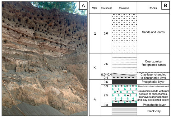 The productive phosphorite series includes rocks of the Volga stage of the Upper Jurassic and the Ryazan horizon of the Lower Cretaceous. It includes the lower and upper phosphorite layers (horizons), separated by a pack of quartz-glauconite sands (Figure 2) [37].