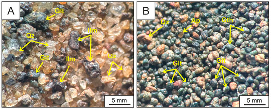 Photos of the bulk sample (A) and glauconite concentrate (B) obtained by electromagnetic separation under a binocular microscope. Ap—apatite, Glt—glauconite, Gth—goethite, Ilm—ilmenite, Qz—quartz.
