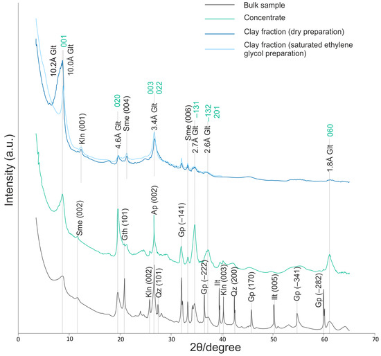 Diffractograms of bulk sample, glauconite concentrate and clay fraction. Ap—apatite, Glt—glauconite, Gp—gypsum, Gth—goethite, Ilt—illite, Kln—kaolinite, Qz—quartz, Sme—smectite.