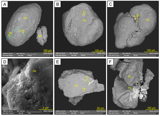 Electronic images: (A–C) globular glauconite with inclusions of apatite (A) and pyrite (B,C); (D) chaotically oriented glauconite flakes; (E) fragment of glauconite grain with sparry apatite aggregate and pyrite veins; (F) split glauconite grain with pyrite inclusion. Ap—apatite, Glt—glauconite, Py—pyrite.