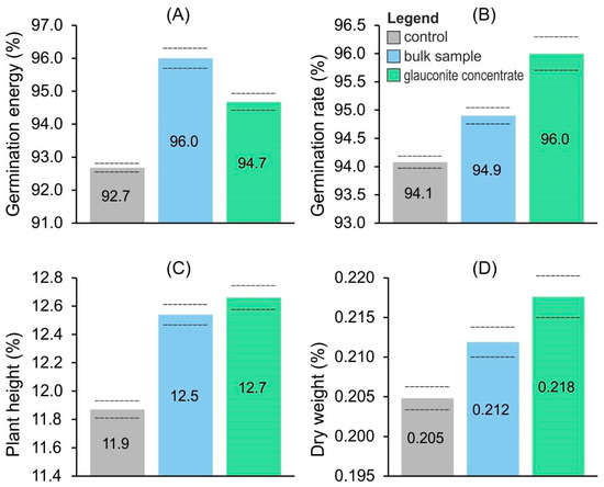The germination rate of the plants in the test cells ranged from 94.9% to 96% (Figure 8B), exceeding the control germination level (94.1%). The highest percentage of germination was achieved with the glauconite concentrate.
