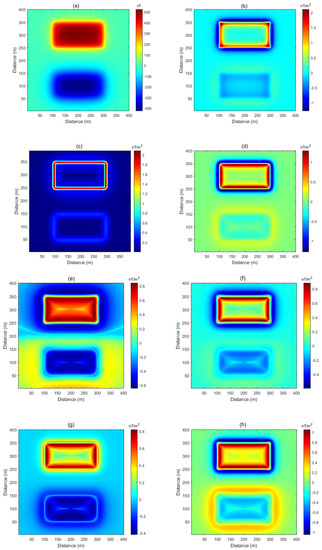 (a) Magnetic data from the two blocks whose outlines are shown. The field inclination/declination was −90°/0°, and the depths of the blocks were 10 km (upper) and 25 km (lower). The magnetisation of the blocks was ±1 A/m. (b) Second vertical derivative of the data shown in (a). (c) TDX of the first vertical derivative of the data. (d) Second derivative in the uphill direction of the data (Equation (7)). (e) Fθ with α = 0.25 and γ = 1 (Equation (9)). (f) Fθ with α = 0.75 and γ = 1. (g) Fθ with α = 0.25 and γ = 0. (h) Fθ with α = 0.25 and γ = 2.