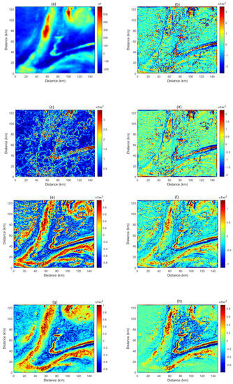 (a) Gravity data from a portion of the Witwatersrand basin, South Africa. The grid interval is 1.0 km. (b) Second vertical derivative of the data shown in (a). (c) TDX of the first vertical derivative of the data. (d) Second derivative in the uphill direction of the data (Equation (7)). (e) Fθ with α = 0.5 and γ = 1 (Equation (9)). (f) Fθ with α = 0.95 and γ = 1. (g) Fθ with α = 0.25 and γ = 0. (h) Fθ with α = 0.25 and γ = 2.