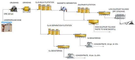 The case study in this paper, the Anglo American Sakatti Ni-Cu-PGE deposit in northern Finland, is being explored for possible future mining operations. The current estimate of the life of the mine is 240 months. In this study, the preliminary mining plan for the 240 months was simplified so that it consists of three main ore types, massive sulfide (MS), stockwork (STW) and disseminated (DISS). These three ore types, all mined underground, cover, on average, 25%, 40%, and 35% of the plant feed over the life of the mine, respectively. Only bulk rougher flotation was simulated in this study, as typically the rougher recovery in an open-circuit laboratory flotation test is known to accurately predict the overall recovery in an industrial-scale closed flotation circuit. In the planned flowsheet for the future Sakatti concentrator plant, the rougher concentrate is sent for Ni-Cu separation to produce saleable Ni and Cu concentrates. A schematic diagram of the Sakatti flowsheet is presented in Figure 1.