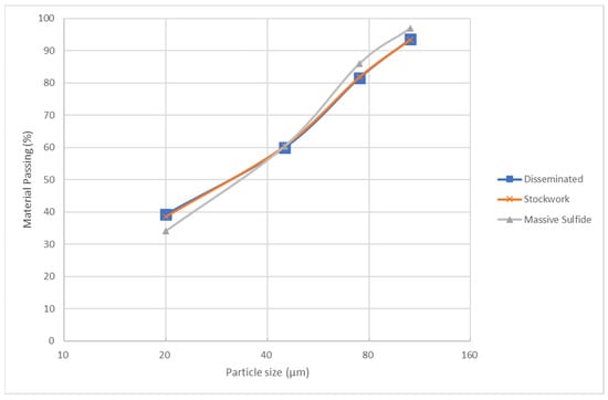 The Massive Sulfide, Stockwork, and Disseminated ore samples were crushed down to 100% being < 1 mm in particle size. The samples were homogenized and divided into 1.5 kg subsamples. Each flotation feed batch was ground in a laboratory rod mill right before flotation to avoid excess oxidation of mineral surfaces. The target grind size was 80% passing 72 µm. The particle-size distribution after grinding is shown in Table 4 and Figure 5, and the laboratory flotation test flowsheet is shown in Figure 6.