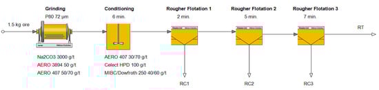 Laboratory flotation test flowsheet. The abbreviations for the test products shown in the flowsheet are RC1–3 for rougher concentrates 1–3 and RT for rougher tailings.