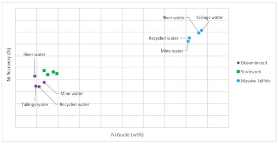 Simulated total nickel grade and recovery to a rougher concentrate for a single ore type using different water types. Numerical values are not given due to confidentiality reasons.