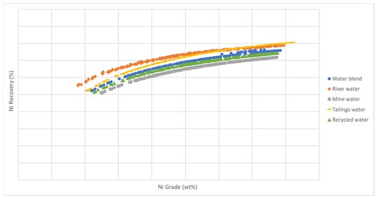 Simulated total nickel grade and recovery to a rougher concentrate with the ore blend as per the mine plan using different water types. Neither the numerical values for the blending ratios of each ore type nor the simulated grades and recoveries are given due to confidentiality reasons.