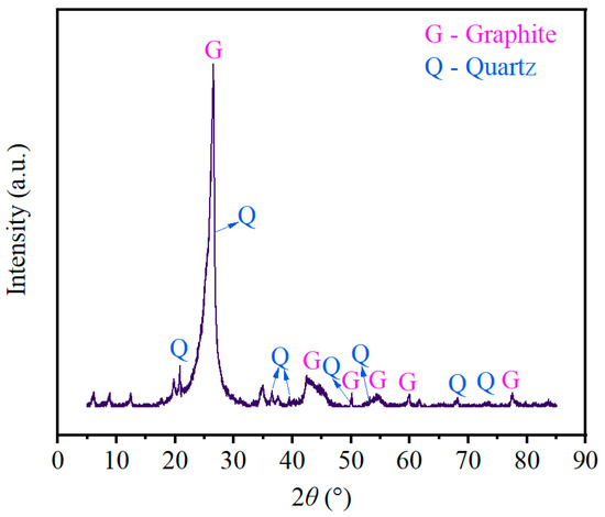 The graphite was characterized using X-Ray diffraction (D8 Advance, Bruker Company, Karlsruhe, Germany). The XRD measurement was performed with a Cu Kα radiation source at 40 kV and 40 mA, a wide-angle diffraction scanning range of 5°–85°, and a scanning rate of 8°/min. The surface morphology and element distribution of graphite were examined using an SEM (FIB-SEM, Helios G4 CX, Thermo Fisher Scientific, Hillsboro, OR, USA), operated at an accelerating voltage of 10.0 kV and a current of 5.5 nA.