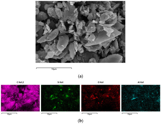 The XRD pattern of raw graphite is shown in Figure 1. It shows that quartz was the predominant gangue mineral in the graphite. Figure 2b shows an EDS image, which revealed the presence of Si, Al, O, and C elements, indicating that the gangue minerals consisted of quartz and some clay minerals with an Al element. This graphite sample and the graphite used in the published paper were taken from the same mining area, so the elemental composition of the impurity minerals in the graphite was consistent. From the published paper, it can be found that the main impurity minerals were SiO2 and Al2O3 [24]. Figure 2 also illustrates that the gangue minerals had an ultrafine size and were embedded in the graphite.
