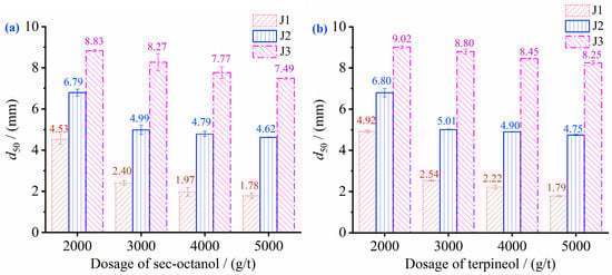 (1) The d50 values of J1, J2, and J3 tended to decrease as the amount of frother increased. When the amount of frother was larger than 3000 g/t and the amount continued to increase, the decrease in the d50 of J1, J2, and J3 became slower. The d50 values of J1, J2, and J3 obtained using sec-octanol were smaller than those obtained using terpineol.