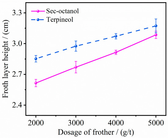 (2) The froth layer height showed a tendency to increase with the increase of the frother dosage. In the case of equivalent dosages of reagents, terpineol produced a slightly higher froth layer height than sec-octanol.