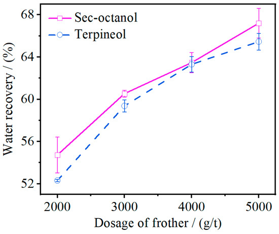 The variation of water recovery versus different dosages of frother throughout the graphite flotation process is shown in Figure 6. As shown in Figure 6, the water recovery increased with the increase of frother dosage. This was consistent with the conclusion of Wiese et al., who studied the effect of frother type and dosage on flotation performance in the presence of high-depressant concentrations [27]. The increase in water recovery could be explained by the bubbles’ size. As the amount of frother increased, the bubble size decreased, thereby increasing the number of bubbles that could fit in the cross-section of the flotation tank, making the froth more stable. This increased the amount of water that was carried between the bubbles that entered the froth layer, leading to an increase in the water recovery during the flotation process [12]. Moreover, the frother dosage also affected the volume of froth, which increased with the increase of the frother dosage. As the flotation process continued, the frother concentration in the slurry decreased, and the excess frother produced more froth. However, less minerals were floated in the later stages of flotation, while most of the froth with water was scraped out, resulting in an increase in the water recovery. The water recovery with sec-octanol was slightly higher than that with terpineol, because sec-octanol produced smaller bubbles in the froth layer, which carried slightly more water than terpineol.