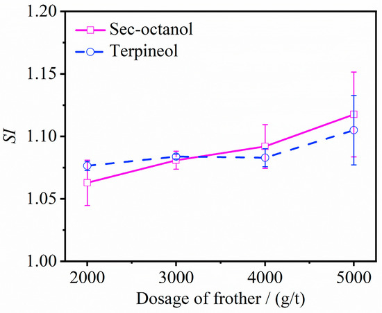 The variation rule of SI value with the amount of frother is shown in Figure 7. As shown in Figure 7, with the increase of the amount of frother, the overall SI values under the conditions of both sec-octanol and terpineol illustrated an increasing trend, while the increase was not significant. Moreover, the difference in SI values between sec-octanol and terpineol was negligible. This could be attributed to the presence of micro-fine gangue minerals embedded in the raw graphite, as revealed by the SEM-EDS analysis in Figure 2. As the graphite ore was not ground before the flotation in this study, the graphite ore was not fully liberated. Hence, the improvement or variation in the flotation selectivity for graphite under the different types and dosages of frother were shown less during the direct flotation process. To address this issue, and considering the physical properties of the graphite ore, it is suggested that the graphite ore, embedded with micro-fine gangue minerals, should be processed by grinding or deep-grinding before flotation, in order to liberate the minerals from one another, thereby enhancing the flotation selectivity of the target minerals [28,29,30].