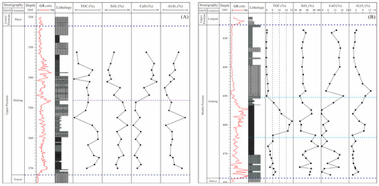 Stratigraphic variations in the gamma-ray (GR) log, lithology, TOC content, and the concentrations of major oxides. (A) the Dalong Formation; (B) the Gufeng Formation.