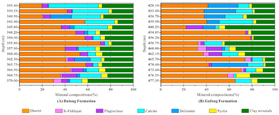 The X-ray diffraction (XRD) results show that the mineralogy is dominated by quartz, carbonates, and clay minerals in both the Dalong and Gufeng Formations. For the Dalong Formation, the quartz content ranges from 19.7 wt.% to 71.1 wt.% (average = 43.8 wt.%), showing higher values in the lower part than in the upper part. The clay content ranges from 13.5 wt.% to 39.9 wt.%, with a mean value of 24.9 wt.%. Carbonate minerals are dominated by calcite with a range of 3.3 wt.% to 43.8 wt.% (average = 16.6 wt.%), displaying a general increasing trend upward (Figure 3A). For the Gufeng Formation, the samples have higher quartz content (average = 49.7 wt.%) than the Dalong Formation. The clay minerals range from 8.1 wt.% to 43.9 wt.% with an average of 21.9 wt.% and are highest in the middle part of the Gufeng Formation. The carbonate minerals are primarily composed of dolomite and calcite and are higher in content in the upper part than in the lower part. The dolomite content ranges from 2.4 wt.% to 31.7 wt.% (average = 18.3%), and the calcite content ranges from 2.2 wt.% to 29.5 wt.% (average = 11.9 wt.%).