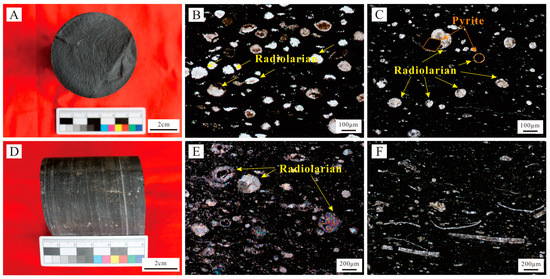 Representative core photographs, thin section, and SEM images of argillaceous–siliceous mixed mudstone (A,B) and carbonaceous mudstone (C–F) in the Gufeng Formation. (A) Thin section image of argillaceous–siliceous mixed mudstone, sample depth = 448.25 m. (B) Thin section image of argillaceous–siliceous mixed mudstone, sample depth = 448.25 m. (C) Macroscopic characteristics of black siliceous mudstone showing sponge spicule, sample depth = 456.20 m. (D). Thin section image showing the preserved radiolarians, sample depth = 458.75 m. (E). Macroscopic characteristics of gray carbonaceous mudstone, sample depth = 460.0 m. (F). Microscopic characteristics of carbonaceous mudstone, sample depth = 458.75 m.