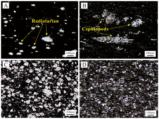 The siliceous mudstone is primarily distributed in the lower-to-middle part of the Dalong Formation, and the lower part of the Gufeng Formation (Figure 2). This lithofacies has the highest quartz content, ranging from 36.0 wt.% to 73.8 wt.% (average = 55.5 wt.%), and relatively low carbonate content, ranging from 2.2 wt.% to 26.0 wt.% (average = 11.9 wt.%). In addition, the siliceous mudstone is rich in organic matter and has a high TOC content, ranging from 5.2 wt.% to 11.4 wt.%, with an average of 8.4 wt.%. Petrographic examination suggests that siliceous mudstone is characterized by gray-black/black color, high silica content, and abundant fossils (e.g., radiolarians, cephalopods) (Figure 4A–C and Figure 5A,B). Some of the siliceous radiolarians were replaced by euhedral pyrite crystals (Figure 4C).