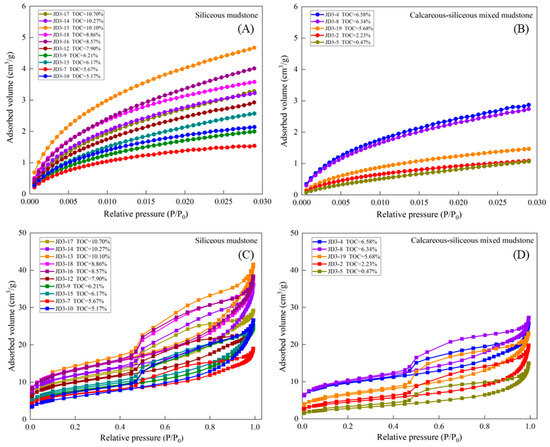Carbon dioxide (CO2) and nitrogen (N2) adsorption isotherms of different shale lithofacies in the Dalong Formation. P/P0 = the ratio of vapor pressure to saturated pressure. The CO2 adsorption isotherms of siliceous mudstone (A) and calcareous-siliceous mixed mudstone (B). The N2 adsorption isotherms of siliceous mudstone (C) and calcareous-siliceous mixed mudstone (D).