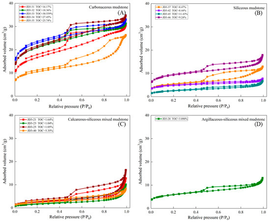According to the IUPAC classification of physisorption isotherms [34] (Thommes et al., 2015), the CO2 adsorption isotherms can be grouped into type I for the Dalong and Gufeng Formations (Figure 10A,B), indicative of micropores development. The hysteresis loops of N2 adsorption isotherms can be classified as type H3 and type H4 (Figure 10C,D and Figure 11), suggesting the predominance of plate-like and slit-like pores. The N2 and CO2 adsorption capacities show significant variations in different lithofacies (Figure 10 and Figure 11). In general, the siliceous mudstone rich in organic matter has a relatively high adsorption volume.