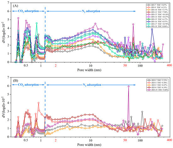 Pore size distribution of the two shale lithofacies in the Dalong Formation measured by CO2 and N2 adsorption analysis. (A) Siliceous mudstone; (B) Calcareous-siliceous mixed mudstone. The dashed line indicates the diameter of ~1.3 nm.