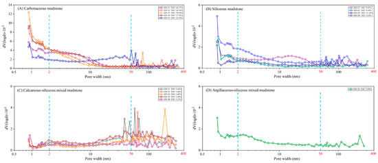 Pore size distributions calculated from the low-pressure N2 and CO2 adsorptions are shown in Figure 12 and Figure 13 and Table 1. The dominant pore diameter ranges show subtle differences between the Dalong and Gufeng Formations. For the Dalong Formation, micropore size distributions based on the DFT model display three volumetric peaks at the pore sizes of approximately 0.35 nm, 0.55 nm, and 0.85 nm for the two mudstone lithofacies (Figure 12). The mesopore and macropore size distributions show slight differences in the siliceous mudstone and calcareous–siliceous mixed mudstone marked by the peaks in the range of 2–30 nm and 2–20 nm, respectively. In comparison with calcareous–siliceous mixed mudstone, the siliceous mudstone generally has a broader size range of mesopore. For the Gufeng Formation, the mesopore and macropore diameter distributions of the calcareous–siliceous mixed mudstone are significantly different from that of the other three lithofacies (Figure 13). Compared with carbonaceous, siliceous, and argillaceous–siliceous mudstones, the pore size for calcareous–siliceous mixed mudstone generally displays few mesopores and relatively more abundant macropores (Figure 13C). The calculated pore size distributions are generally consistent with the SEM observations.