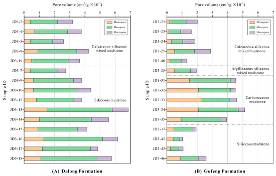 The relative proportion of micro-, meso-, and macropore volumes in total pore volume shows subtle variations in different lithofacies (Figure 14). The siliceous mudstone and carbonaceous mudstone have a high pore volume, and relative contributions of micropores and mesopores to total pore volume in both the Gufeng and Dalong Formations. In contrast, the calcareous–siliceous mixed mudstone is characterized by high mesopores and macropores, the largest contribution to the total pore volume (Figure 14B).