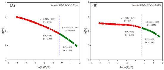 Fractal dimensions were applied to evaluate the irregularity and complexity of the pore structure, and further assess the adsorption capacity of the shales [35,36]. In this study, fractal dimensions were calculated using the commonly used Frenkel–Halsey–Hill (FHH) model based on the N2 adsorption isotherm data [23,35]. The FHH model can be described by the following equation: