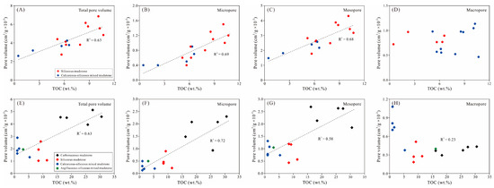 Correlations between TOC content and pore volumes of micropores, mesopores, and macropores. (A–D) the Dalong Formation; (E–H) the Gufeng Formation.