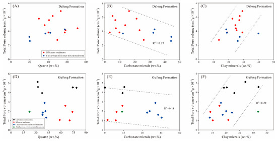 Correlations between total pore volume and primary mineral compositions of the Gufeng and Dalong Formations. (A–C) the Dalong Formation; (D–F) the Gufeng Formation.