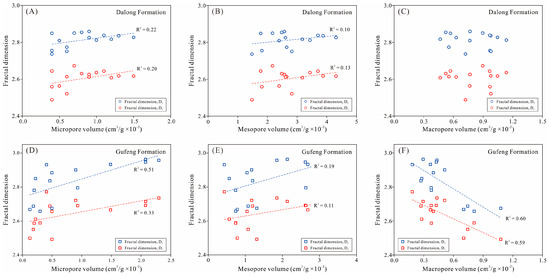 Correlations between fractal dimensions (D1, D2) and pore volumes of micropores, mesopores, and macropores in the Dalong and Gufeng Formations. (A–C) The relationship between fractal dimensions and pore volume for different pore in the Dalong Formation. (D–F) The relationship between fractal dimensions and pore volume for different pore in the Gufeng Formation.