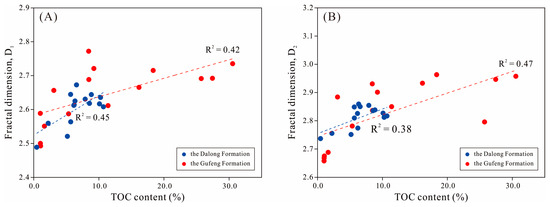 Correlations between fractal dimensions (D1, D2) and TOC content of the Gufeng and Dalong Formations. (A) The relationship between D1 and TOC. (B) The relationship between D2 and TOC.