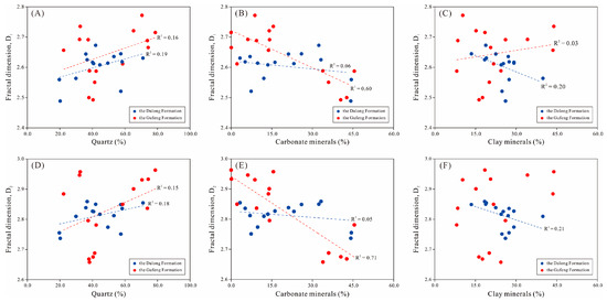 Correlations between fractal dimension (D1, D2) and major mineral compositions of the Gufeng and Dalong Formations. (A–C) The relationship of D1 and the content of quartz, carbonate and clay minerals. (D–F) The re-lationship of D2 and the content of quartz, carbonate and clay minerals.