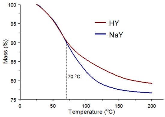 When heated to temperatures below 200 °C, HY and NaY powders lose water contained within the zeolite cage system [35,36,37,38]. The temperature dependencies of these water desorptions were compared by using thermogravimetry. Mass loss thermograms obtained by heating 6 mg samples from 25 to 200 °C are shown in Figure 1. The HY and NaY curves were nearly identical between 25 and 70 °C. At higher temperatures, the NaY sample exhibited a greater mass loss rate than the HY sample. Both curves tended to level off above 150 °C, signifying a near complete loss of adsorbed water. The HY and NaY samples lost 19.0 and 22.4 percent of their initial masses at 150 °C and 20.8 and 23.3 percent at 200 °C, respectively.