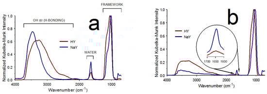 Hu et al. reported that zeolite Y unit cell volumes increased with temperature [28]. Because the thermal expansion of the zeolite framework should be temperature-dependent, these effects should appear in reversible difference spectra. Thus, the 1250–850 cm−1 band profiles exhibited by reversible difference spectra in Figure 6 and Figure 7 primarily represent the thermal expansion of the zeolite framework, whereas water loss dictated the band profiles in irreversible spectra. The framework vibration band features in reversible difference spectra differed for HY and NaY, indicating that the H+ and Na+ counterions affected these expansions and contractions differently.