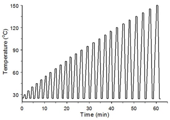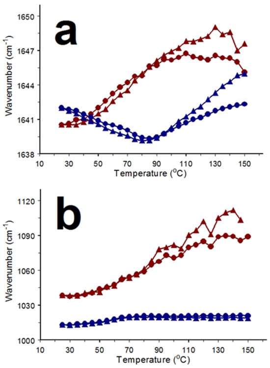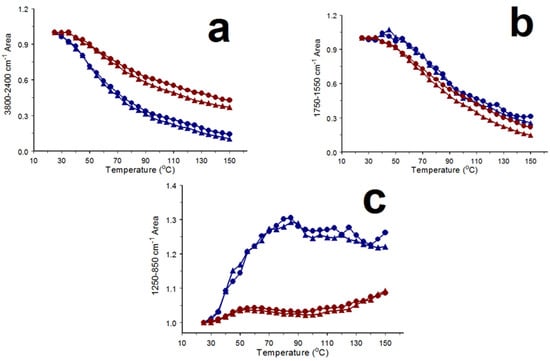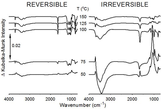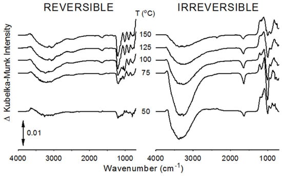 Information regarding the reversibility of temperature-dependent vibration band intensity changes was derived from the infrared spectra acquired during the temperature step heating profile [34,39]. As shown by the temperature program depicted in Figure 3, each spectrum obtained between 30 and 150 °C was preceded and followed by a spectrum measured at 25 °C. Reversible spectrum changes were revealed by subtracting the spectrum obtained at 25 °C after cooling from the spectrum measured at the step temperature. Subtracting the 25 °C spectrum acquired prior to the step temperature from the 25 °C spectrum obtained after cooling revealed spectrum changes caused by the temperature increase that were not reversed upon cooling the sample (i.e., irreversible).