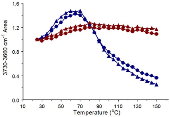 Figure 4 shows infrared spectrum band area-versus-temperature trends for the HY (red) and NaY (blue) samples. Areas were normalized by ratioing them to the area calculated from the infrared spectrum acquired prior to sample heating. Triangles denote areas derived from spectra obtained at each step temperature, whereas circles represent areas in spectra measured at 25 °C after cooling from the step temperature. In most instances, areas derived from spectra obtained after cooling (circles) were slightly larger than those measured at the step temperatures (triangles). Typically, differences in these areas were smaller for the lower step temperatures.