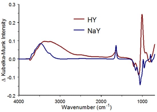 Infrared spectrum changes caused by exposing dehydrated HY (red) and NaY (blue) samples to the spectrophotometer purge at 10 °C for 2 h.