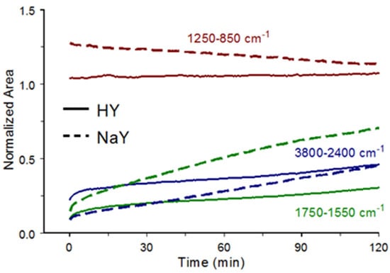 Total sample mass losses at 200 °C were 20.8% for HY and 23.3% for NaY (Figure 1), which are within the typical range for faujasite zeolites [38,45]. The slower HY mass loss rate exhibited above 70 °C likely reflects the effects of strong hydrogen bonding between water molecules and HY Brønsted acid sites. In contrast, primarily electrostatic interactions would be expected between Na+ and water molecules. Previous X-ray diffraction measurements revealed that Na+ cations migrate within zeolite cages during NaY thermal dehydration [28]. These movements would be expected to impact framework vibrations and alter water molecule local environments, affecting the vibration bands of these functionalities. NaY band area changes observed while heating samples and during rehydration at 10 °C can be correlated with trends in the O-H stretching vibration band area. For example, the area of this band decreased the most for the NaY sample between 25 and 80 °C and the NaY 1250–850 cm−1 integrated area increased dramatically over this temperature range. The O-H stretching vibration band area increase was approximately linear during the 2 h isothermal period (Figure 10). Similarly, the 1250–850 cm−1 band area loss was also linear.