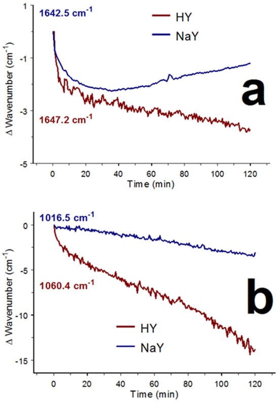 Figure 11 depicts the H-O-H bending and framework stretching vibration band maximum wavenumber trends during the 2 h isothermal period. Both graphs indicate shifts from the initial wavenumbers, which are listed for each curve. The HY H-O-H band wavenumber exhibited a gradual increasing red shift, whereas the NaY band initially exhibited a red shift followed by a blue shift after 30 min (Figure 11a). Infrared spectra for both samples exhibited red shifts for the framework vibration band wavenumber (Figure 11b). However, the wavenumber shifts were much larger in the HY spectra.